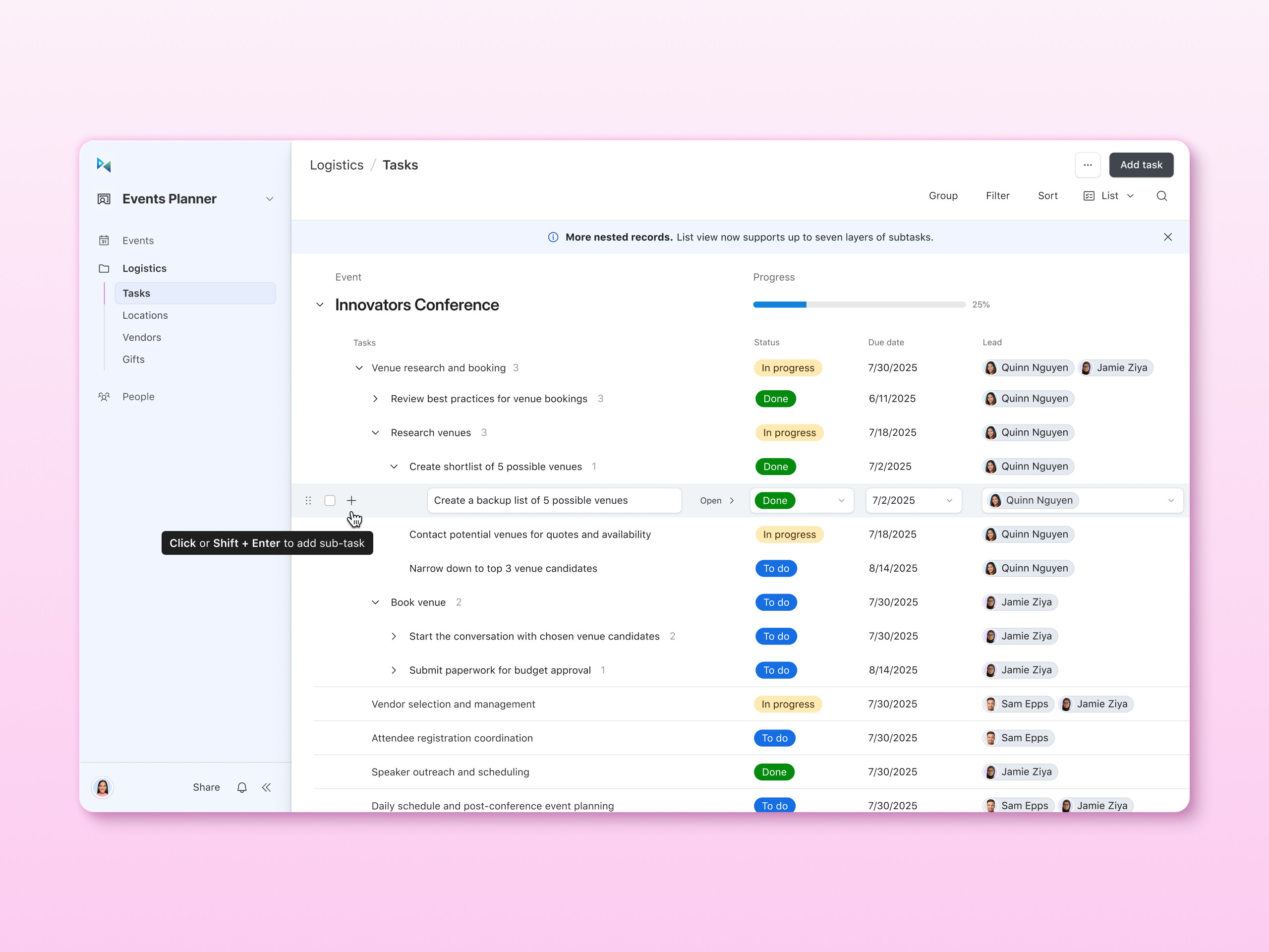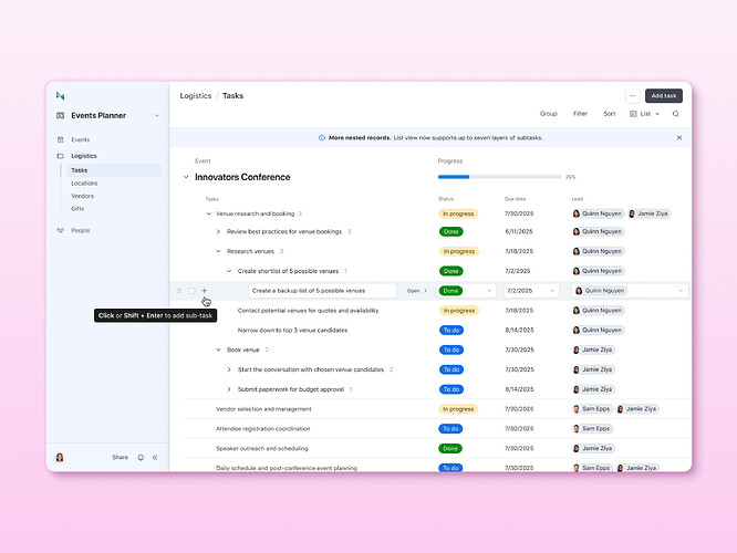List View v Interfacech teď zvládnou hlubší hierarchii: u jedné tabulky můžete mít až 7 vnořených úrovní (typicky self-link „Parent task“) – v kombinaci s třemi úrovněmi napříč tabulkami to dává celkem až 10 pater. Fajn pro velké projekty, ale v praxi držte 2–3 patra, ať se tým neztratí.